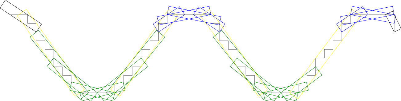 This example outputs the cover of an open digital curve by maximal DSSs. Maximal DSSs are displayed in blue, green, yellow in convex, concave, inflexion parts respectively. Ends are black. Convex (resp. concave) parts are defined as sequences of maximal DSSs of increasing (resp. decreasing) slope.