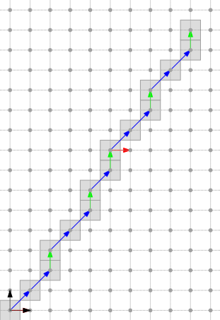 Below, three naive DSLs are depicted in the first three octants. Vectors mySteps.first ( \( v \)), mySteps.second ( \( w \)) and myShift ( \( s \)), are repectively depicted in blue, green and red. The two vectors of the orthonormal basis are depicted in black.