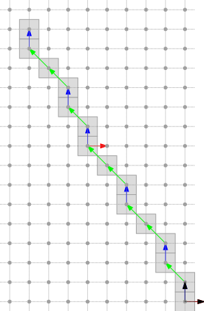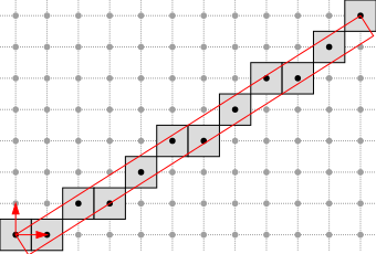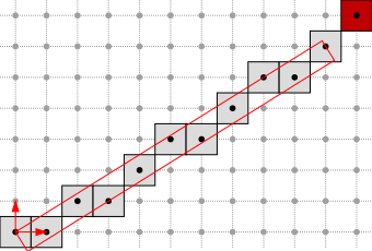 The arithmetical representation \( (a, b, \mu) \) is redondant. Exactly two representations describe one DSL. For instance, \( D(2,5,0) \) and \( D(-2,-5,-5) \) corresponds to the same set of points. This representation is thus interesting, since it includes an orientation preferably chosen to iterate over the DSL points from any point belonging to the DSL.