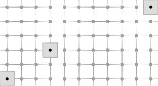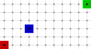 The following code snippet defines three points and a rectangular domain in Z2. It then displays them in a Board2D object. The two last commands export the graphics in SVG and EPS format. The full code is in dgtalBoard2D-1-points.cpp.