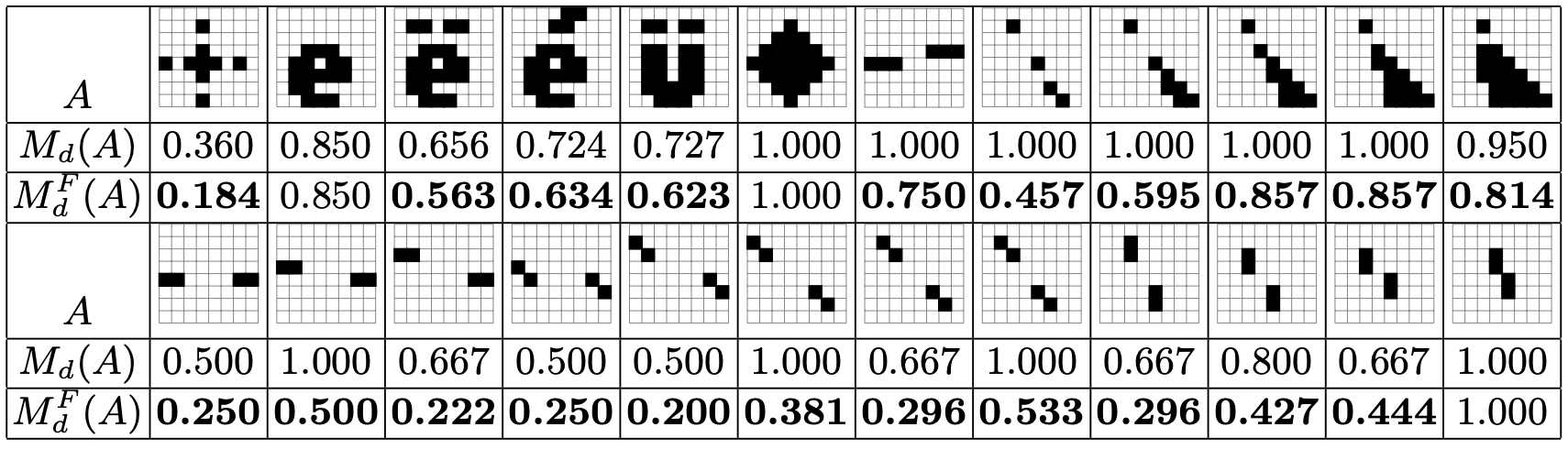 The figure below illustrates the links and the differences between the two convexity measures Md and MdF on simple 2D examples. As one can see, the usual convexity measure may not detect disconnectedness and it is sensitive to specific alignments of pixels. On the contrary, full convexity is globally more stable to perturbation and is never 1 when sets are disconnected.