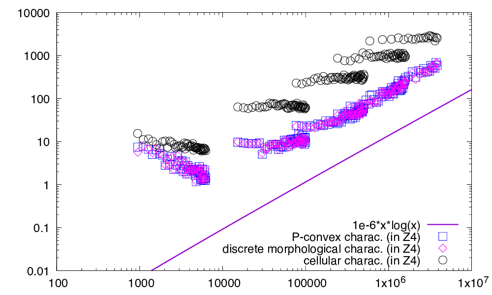 | This figure displays the respective computation times (ms) in \( \mathbb{Z}^4 \) of P-convexity (as squares), discrete morphological characterization (as diamonds) and cellular characterization (as disks), as a function of the cardinal of the digital set. Left: digital sets are randomly generated in a given range with a target point density from \( 10\% \) to \( 90\% \). Right: digital sets are randomly generated so that they are either 0-convex or fully convex. | |