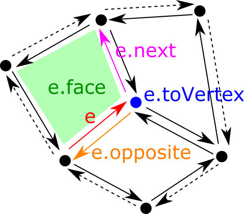 A half-edge data structure is a way to represent the topology of a combinatorial surface. A combinatoirial surface is a union of vertices, edges (a curve bordered by two vertices), faces (a piece of surface bordered by a sequence of edges). They are often called 0-cells, 1-cells and 2-cells respectively. The half-edge data structure describes which cells are connected to each other. Its principle is to associate two half-edges to each edge. Once this is done, it is easy to tie cells together by simply indicating for each half-edge: