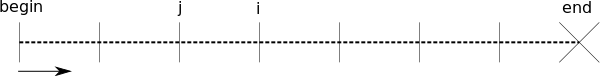 A range of a linear data structure is illustrated below (normal values are depicted with a small straight segment, whereas the past-the-end value is depicted with a cross). In this example, [i,j) is not a valid range because j cannot be reached from i and the whole range may be denoted by [begin,end).