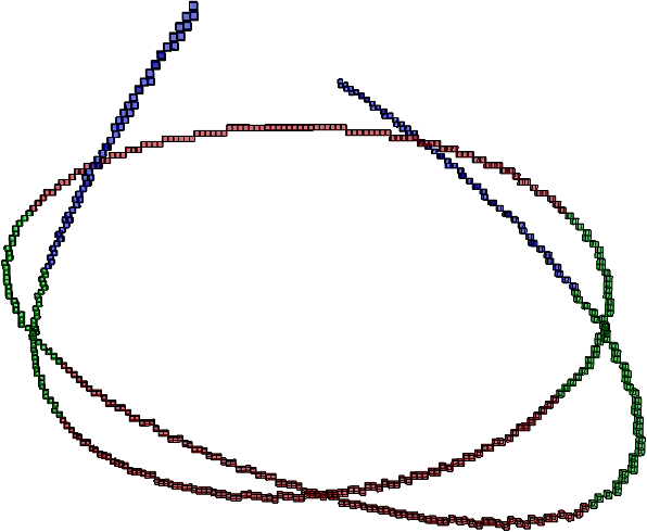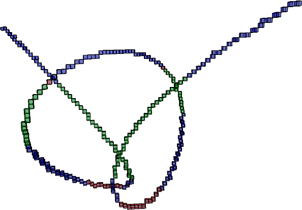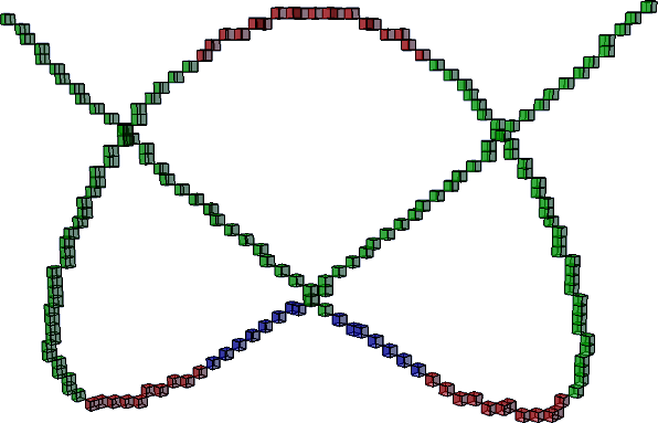 By trying to digitize a curve with a high, with respect to the grid, curvature we can arrive at a connectivity problems. For instance, if we consider an elliptic helix of radii 20, 1 and period distance 1, and \( K_{NEXT} = 2 \), we can observe connectivity issues i.e., there are at least three points such that they are 26-connected to each other and therefore the curve is not 26-connected in such a place.