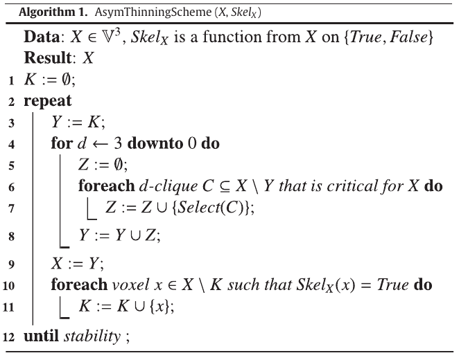 In VoxelComplexFunctions.h a couple of thinning methods are implemented in a functional style, taking a VoxelComplex, a Select function, and a Skel function.