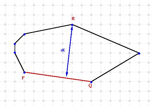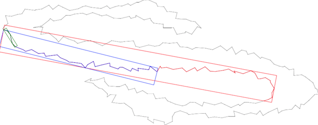 The implementation proposed here relies on the convex hull computed incrementally with the Melkman algorithm in linear time [93] (by using the MelkmanConvexHull class, see the module main documentation: Melkman's algorithm). It allows to add point on the front of the current segment and the value of vertical/horizontal thickness are computed in linear time by using the rotating caliper algorithm (see Convex hull thickness). The Buzer optimisation [88] to update the convex hull thickness with a coast of \(O(log\ n) \) or the linear time point subtraction are not yet implemented. Note that you can use also the Euclidean thickness (see illustration below) also defined from the rotating caliper algorithm.