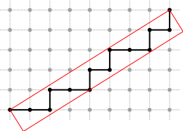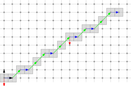 You may have noticed that myLowerBound ( \( \mu \)) is a member of type ArithmeticalDSL::Integer, whereas myA ( \( a \)) and myB ( \( b \)) are members of type ArithmeticalDSL::Coordinate. For any lower leaning point of coordinates \( (x, y) \) such that \( ax - by = \mu \), myLowerBound may require \( 2n+1 \) bits if \( a \) and \( b \) are stored with \( n \) bits. Therefore, NaiveDSL and StandardDSL have not only one template parameter, but two. The first one for the coordinates and the slope, the second one, which should represent a larger domain of integers, for the intercepts and the remainders.