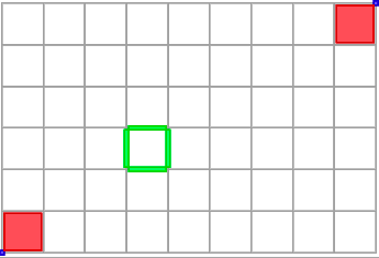 The full code of this example is in file ctopo-1.cpp. Pointels or 0-cells are displayed in blue, linels or 1-cells in green, pixels or 2-cells in red. Note that KhalimskySpaceND::uCell requires Khalimsky coordinates while the two others require digital coordinates (the topology is known in the two latter cases).