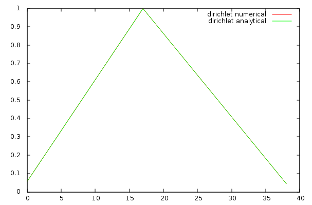 Solving the problem is achieved by using the same code as for the Neumann case. This time the analytic solution is piece-wise linear and take a constant null value at the border of the structure, as expect from the Dirichlet boundary condition.