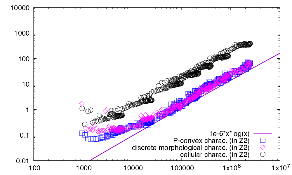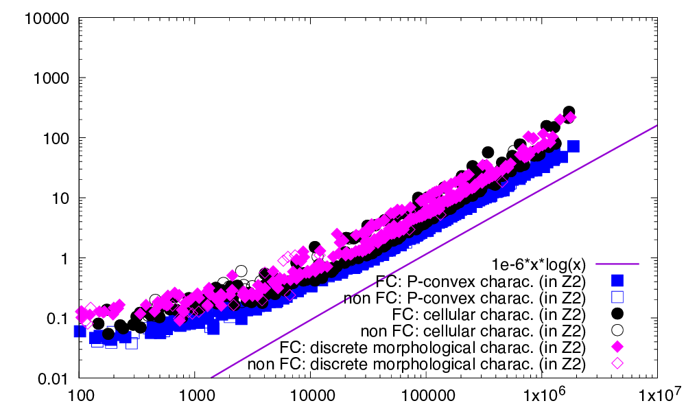 | This figure displays the respective computation times (ms) in \( \mathbb{Z}^2 \) of P-convexity (as squares), discrete morphological characterization (as diamonds) and cellular characterization (as disks), as a function of the cardinal of the digital set. Left: digital sets are randomly generated in a given range with a target point density from \( 10\% \) to \( 90\% \). Right: digital sets are randomly generated so that they are either 0-convex or fully convex. | |
