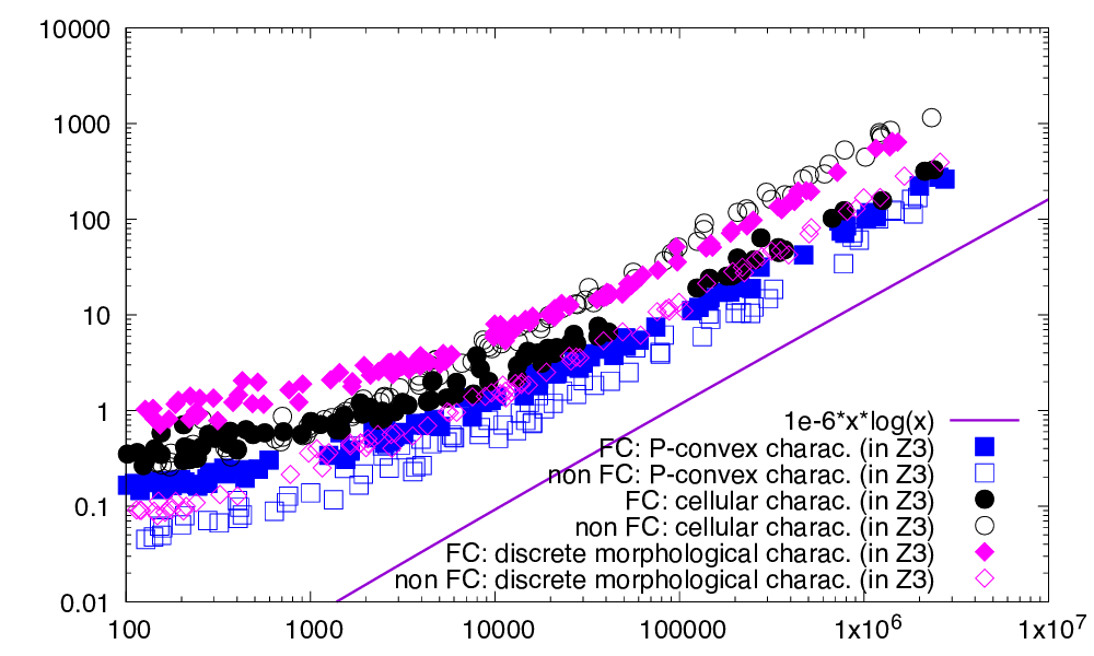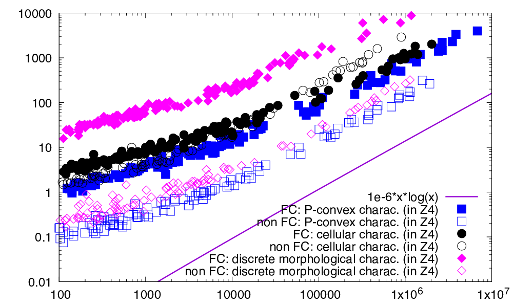 | This figure displays the respective computation times (ms) in \( \mathbb{Z}^4 \) of P-convexity (as squares), discrete morphological characterization (as diamonds) and cellular characterization (as disks), as a function of the cardinal of the digital set. Left: digital sets are randomly generated in a given range with a target point density from \( 10\% \) to \( 90\% \). Right: digital sets are randomly generated so that they are either 0-convex or fully convex. | |