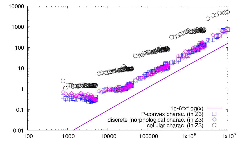 | This figure displays the respective computation times (ms) in \( \mathbb{Z}^3 \) of P-convexity (as squares), discrete morphological characterization (as diamonds) and cellular characterization (as disks), as a function of the cardinal of the digital set. Left: digital sets are randomly generated in a given range with a target point density from \( 10\% \) to \( 90\% \). Right: digital sets are randomly generated so that they are either 0-convex or fully convex. | |