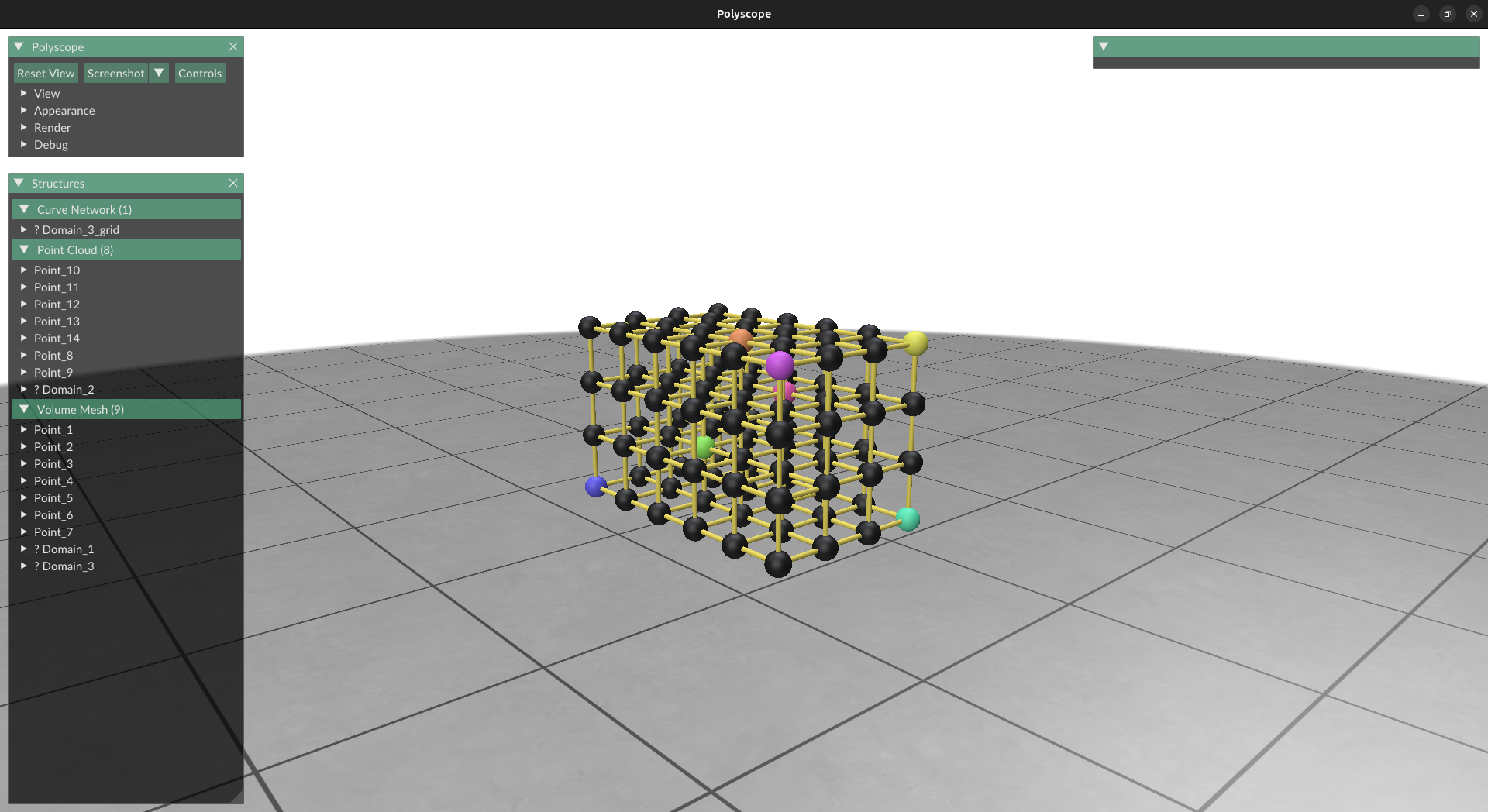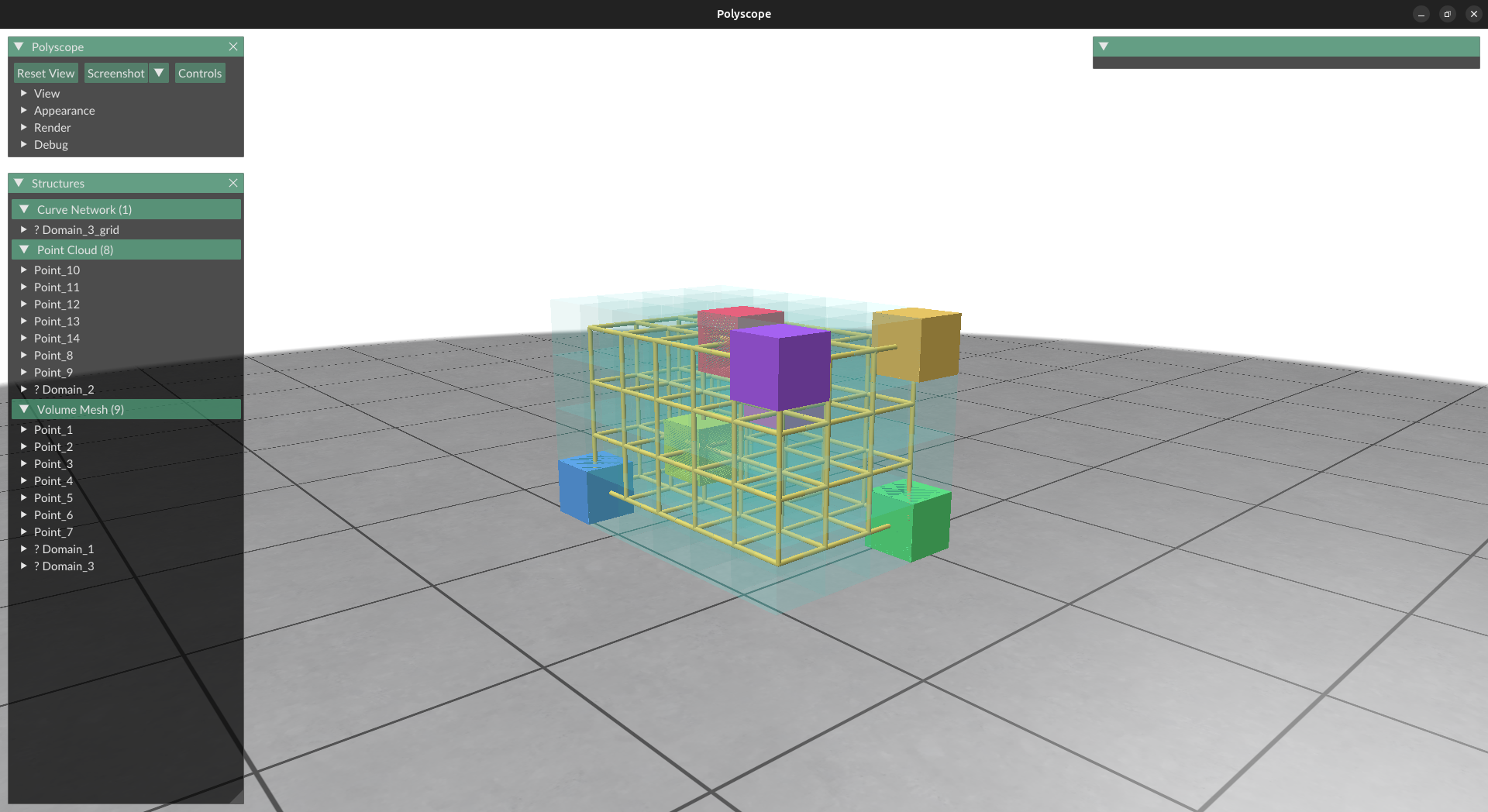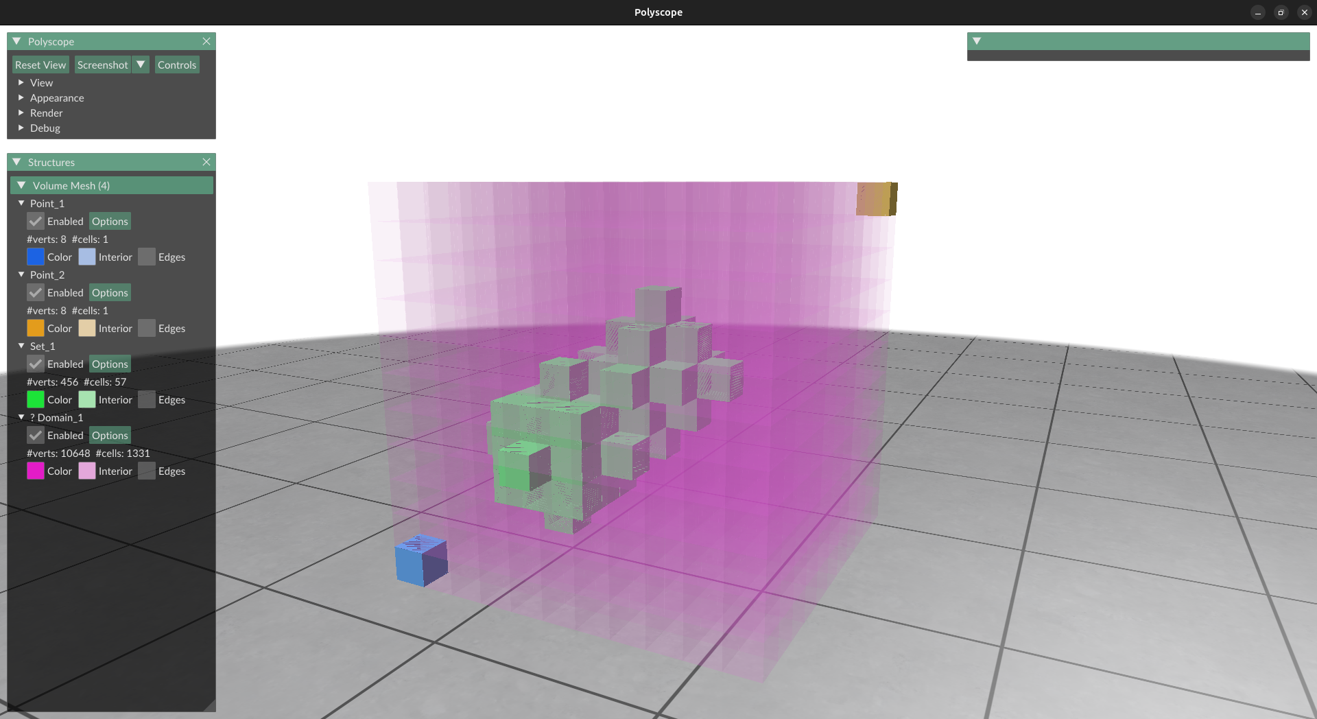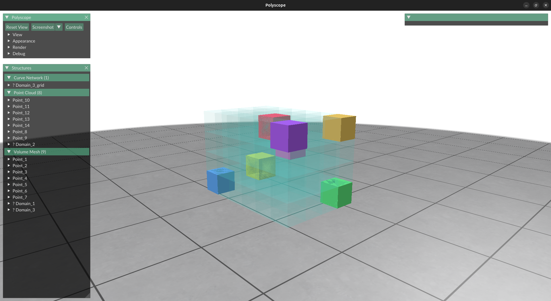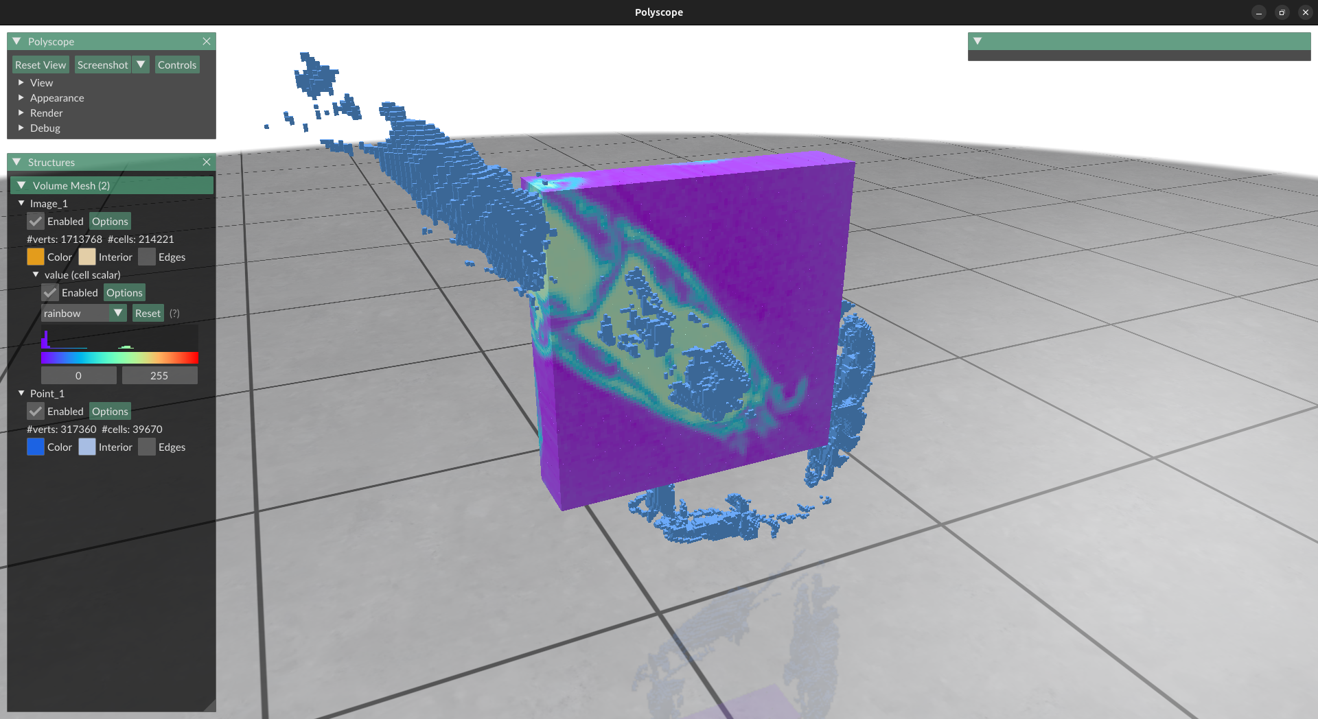 cmake step, e.g. with cmake .. -DGTAL_WITH_POLYSCOPE_VIEWER=true.The class PolyscopeViewer is a wrapper around the Polyscope library ( https://polyscope.run ). It permits displaying geometrical data such as Point, Lines and (volumetric) meshes. The library handles 3D scenes movement and allows to attributes of displayed objects (such as colors and colormaps). The graphical interface is based on ImGUI (https://github.com/ocornut/imgui) which can be further extended.