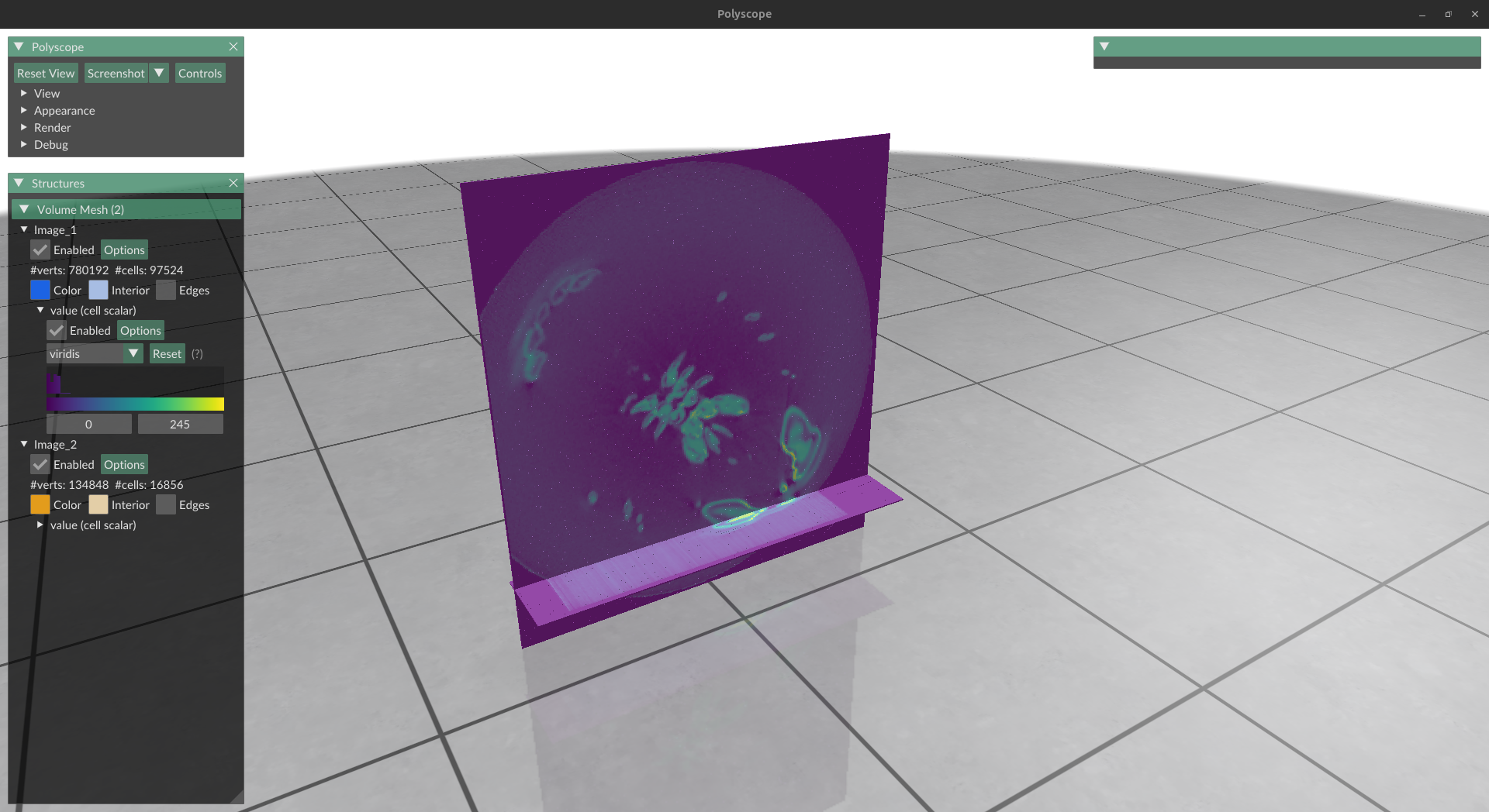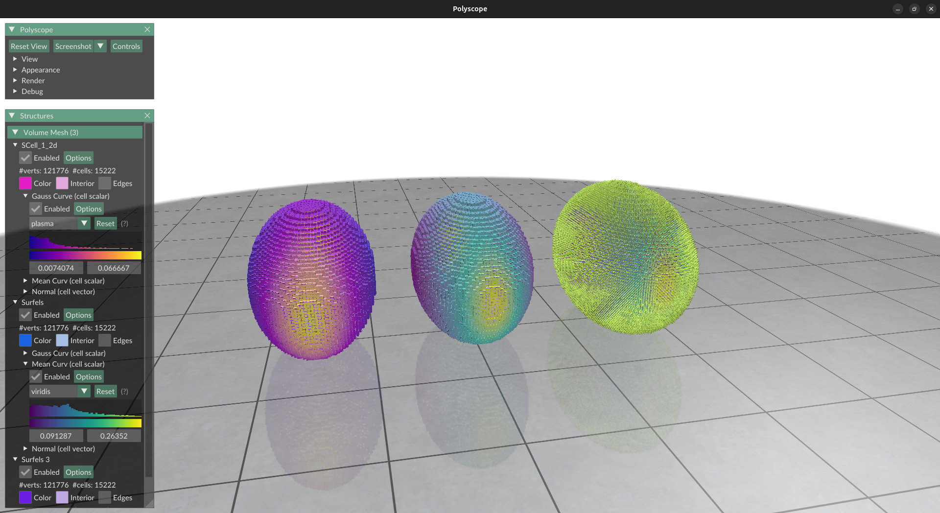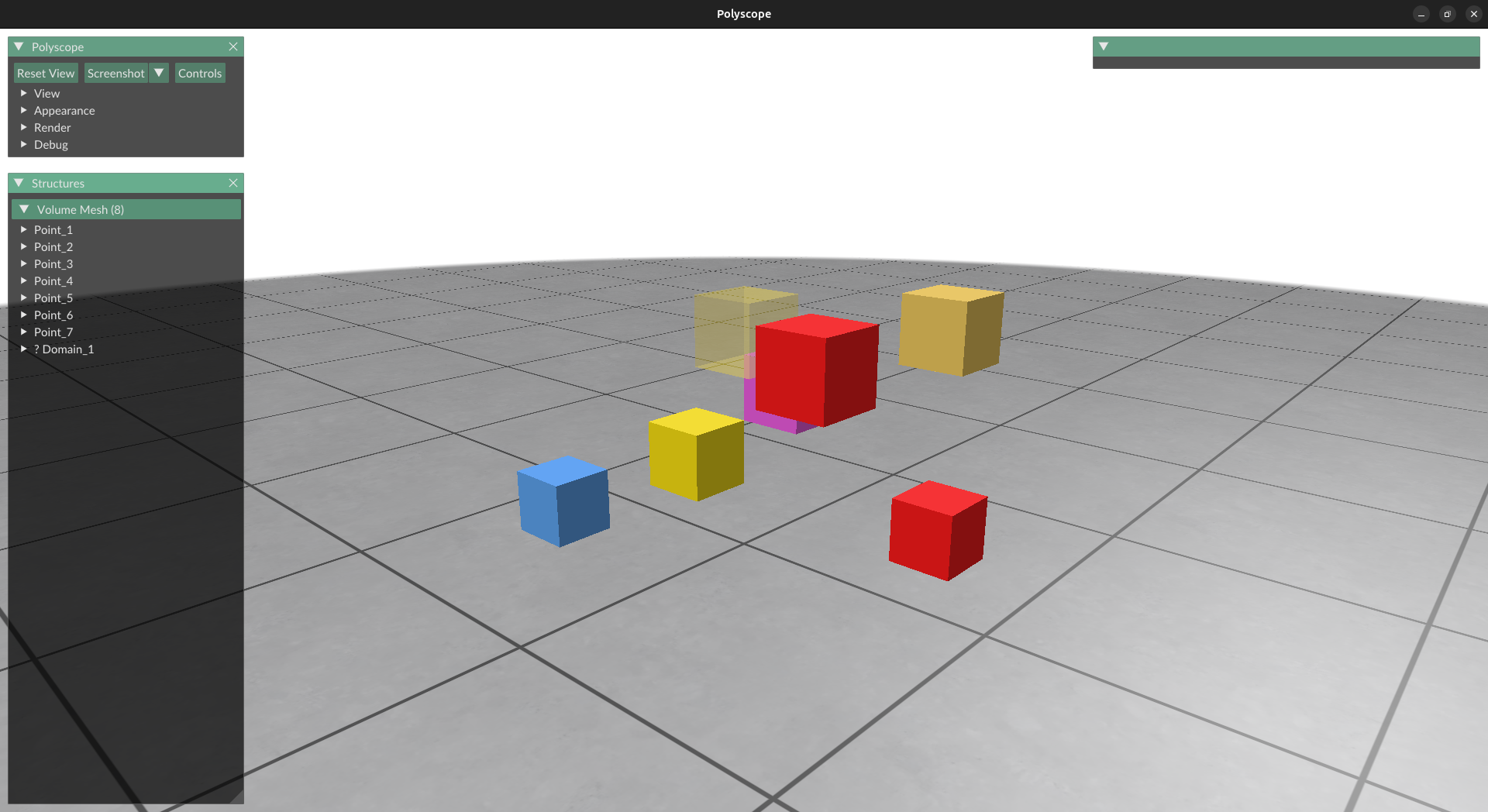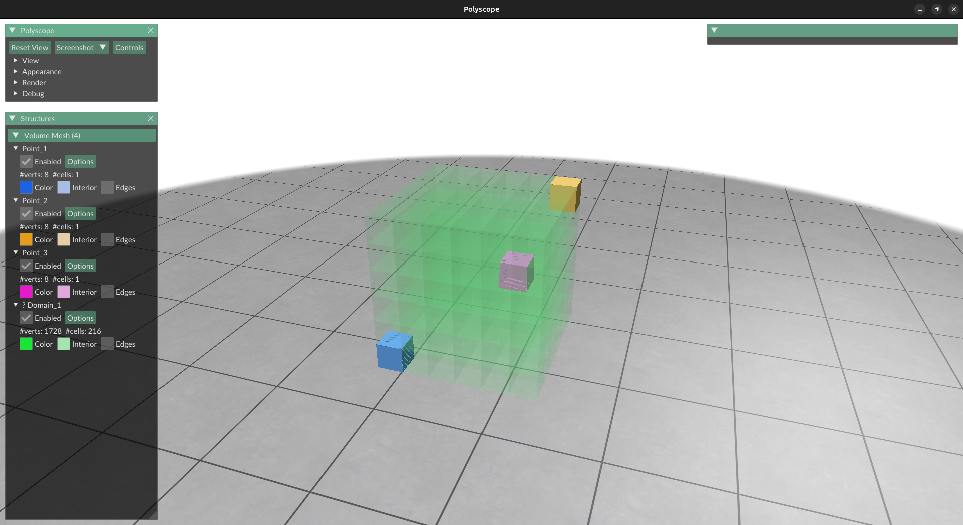 cmake step, e.g. with cmake .. -DGTAL_WITH_POLYSCOPE_VIEWER=true.The class PolyscopeViewer is a wrapper around the Polyscope library ( https://polyscope.run ). It permits displaying geometrical data such as Point, Lines and (volumetric) meshes. The library handles 3D scenes movement and allows to attributes of displayed objects (such as colors and colormaps). The graphical interface is based on ImGUI (https://github.com/ocornut/imgui) which can be further extended.