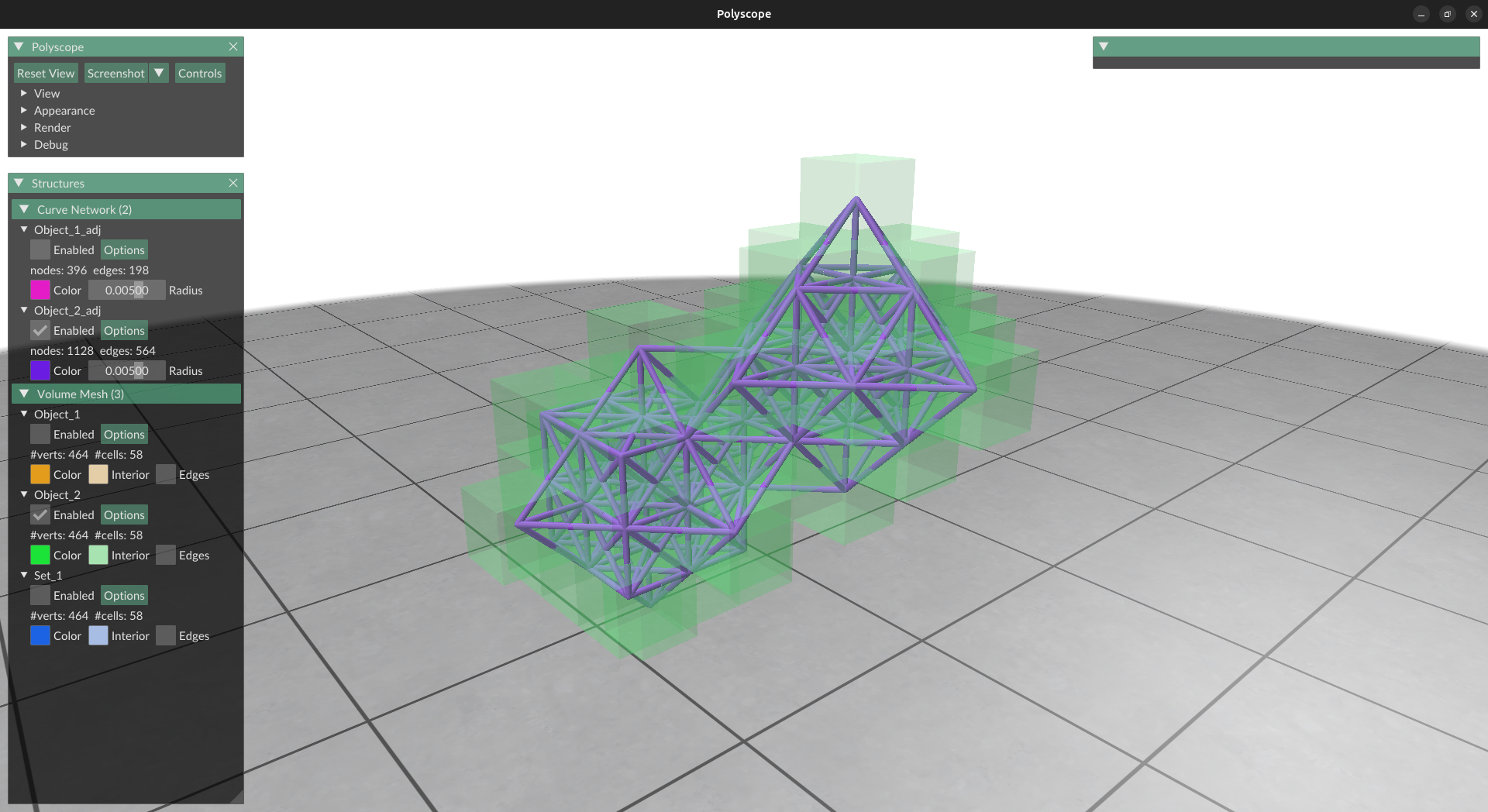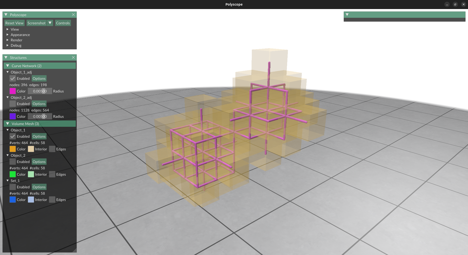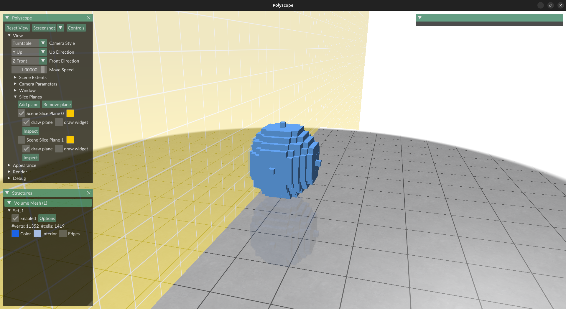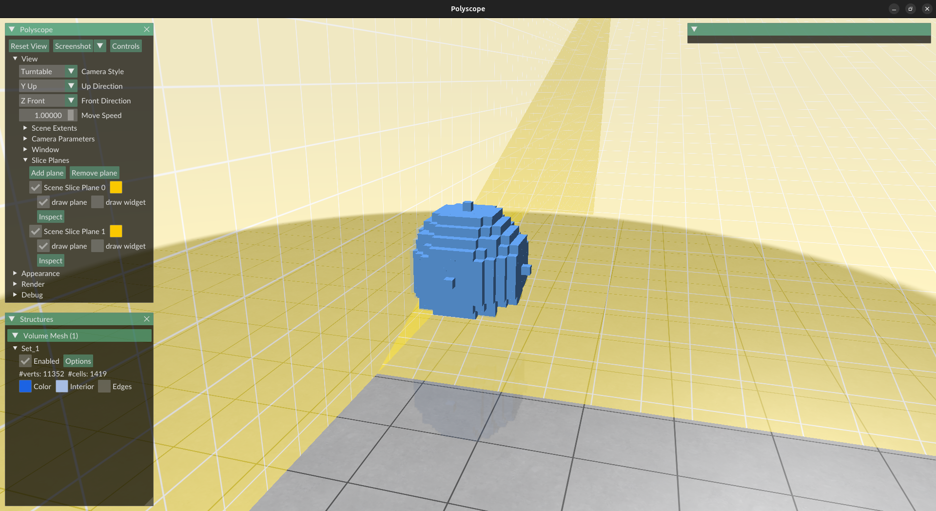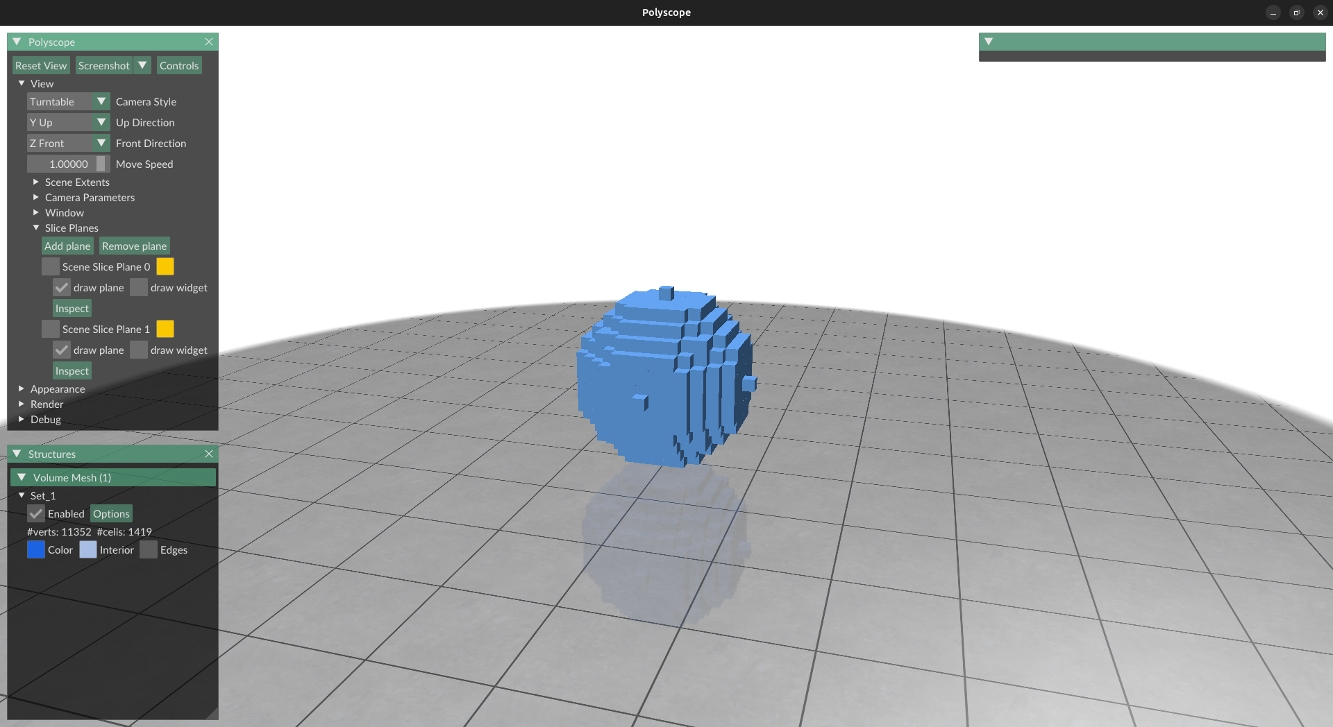 cmake step, e.g. with cmake .. -DGTAL_WITH_POLYSCOPE_VIEWER=true.The class PolyscopeViewer is a wrapper around the Polyscope library ( https://polyscope.run ). It permits displaying geometrical data such as Point, Lines and (volumetric) meshes. The library handles 3D scenes movement and allows to attributes of displayed objects (such as colors and colormaps). The graphical interface is based on ImGUI (https://github.com/ocornut/imgui) which can be further extended.