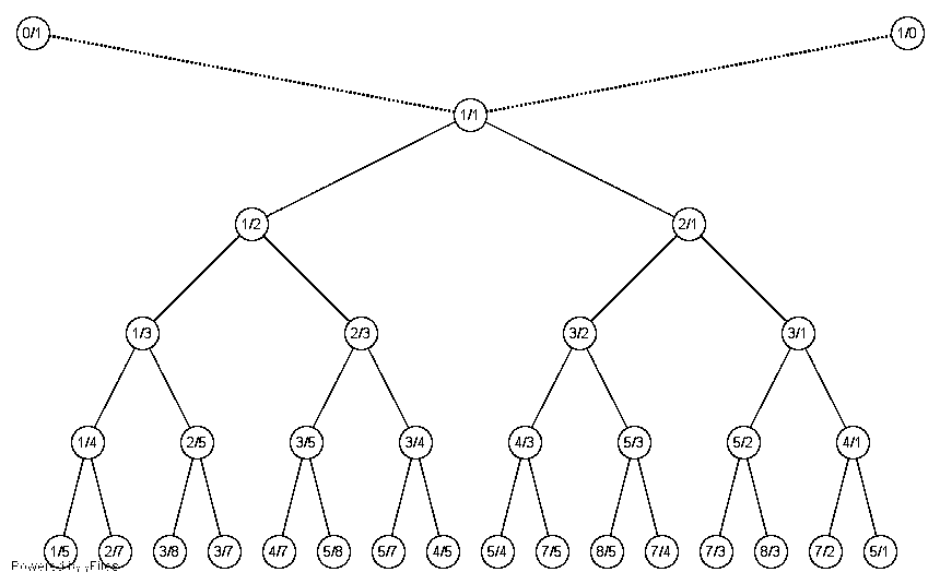 Another (but one-to-one) way of seeing irreducible fractions is the Stern-Brocot tree. Place the fractions 0/1 and 1/0 at the top, then for each pair of consecutive fractions \(\frac{p}{q}\) and \(\frac{p'}{q'}\) compute its mediant \(\frac{p+p'}{q+q'}\). The fraction 1/1 appears first, then 1/2 and 2/1, then 1/3, 2/3, 3/2, 3/1, etc.
