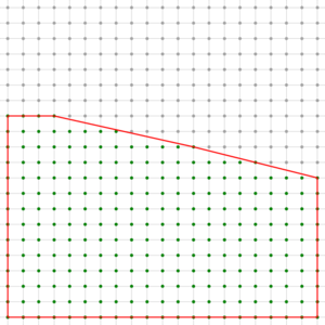 It is sometimes useful to enumerate all the integer points lying within the polygon bounds. The method LatticePolytope2D::getIncludedDigitalPoints() is templated by the type TDigitalSet, which must be a model of CDigitalSet. It modifies the digital set given in parameter so as to holds these points. For now, the complexity is not optimal. If D is the size of the domain of TDigitalSet, N the number of vertices of the polygon, then the complexity is upper bounded by O(ND log(D)) (if TDigitalSet is DigitalSetBySTLSet).