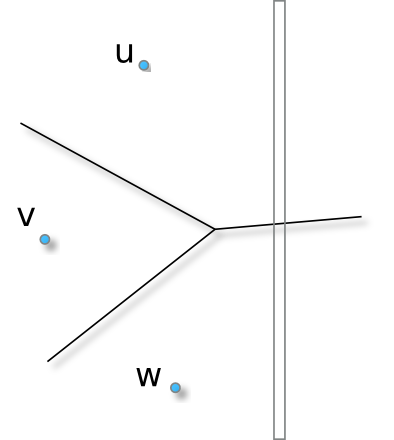 The separable metric concept is a refinement of the CMetricSpace (resp. CPowerMetric) concept in which we require models to implement a method hiddenBy(u,v,w,startingPoint,endPoint,dim): given three digital points u, v, w and an isothetic segment defined by the pair [startingPoint, endPoint] along the dimension dim, such method returns true if Voronoi cells of u and w hide the Voronoi cell if v on the segment. Such predicate can be illustrated as follows: