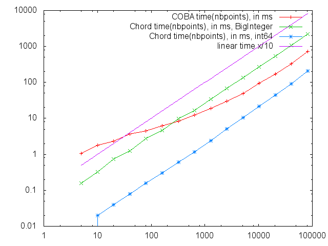 - Practical speed: both algorithms are very comparable. (CHORD) seems slightly faster than (COBA) on average (but this was not tested on many architecture). According to the graph below, obtained with programs testCOBANaivePlaneComputer-benchmark.cpp and testChordNaivePlaneComputer-benchmark.cpp, (CHORD) is faster for a number of points below 200 while (COBA) is best for a big number of points. However, if the diameter is not too big, ChordNaivePlaneComputer with int64_t seems always faster.