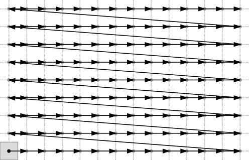 By default, HyperRectDomain iterators use the lexicographic order on the dimensions. To visualise this order in dimension 2, we can use the following code snippet in which we display each point by a color map from blue to red according to the order (blue point corresponds to the first point and the red one to the last point). Note that in this example, we use a specific drawing primitive (draw) in order to draw a SpaceND::Vector as an arrow..