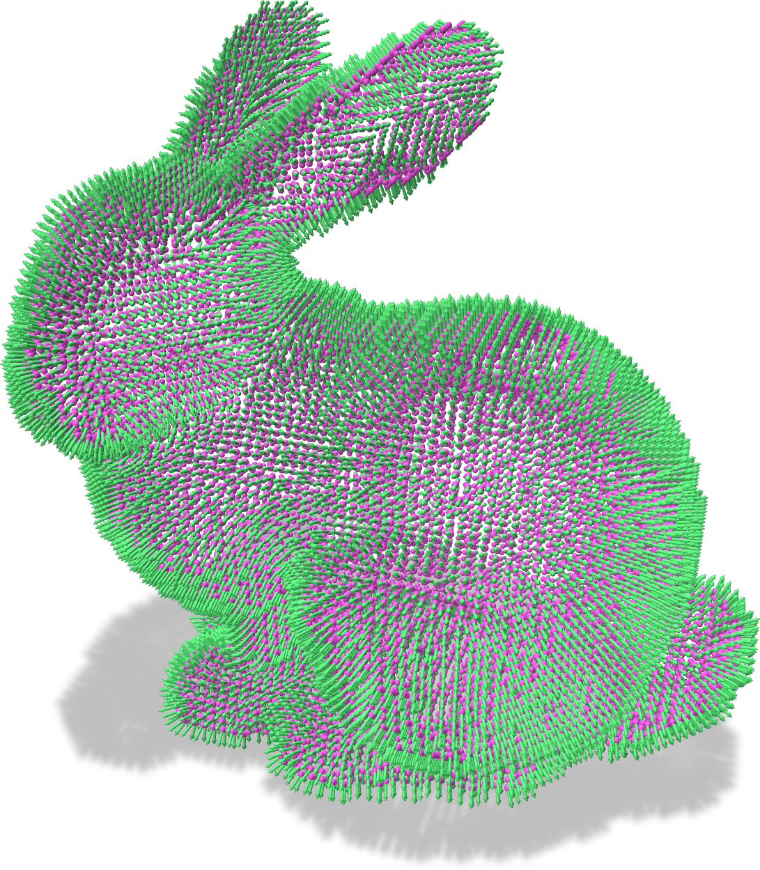 where \( a_i\) is some area contribution of the point \( p_i\) to the surface (computed from the projection of the k-nearest neighbors to \( p_i\) onto the tangent plane at \( p_i \)). By thresholding the winding function with some values in \([0,1]\), we can define an iso-surface that approximates the exterior envelope of the shape defined by the oriented point cloud. For fast computations, we rely on the libigl of the generalized winding numbers.